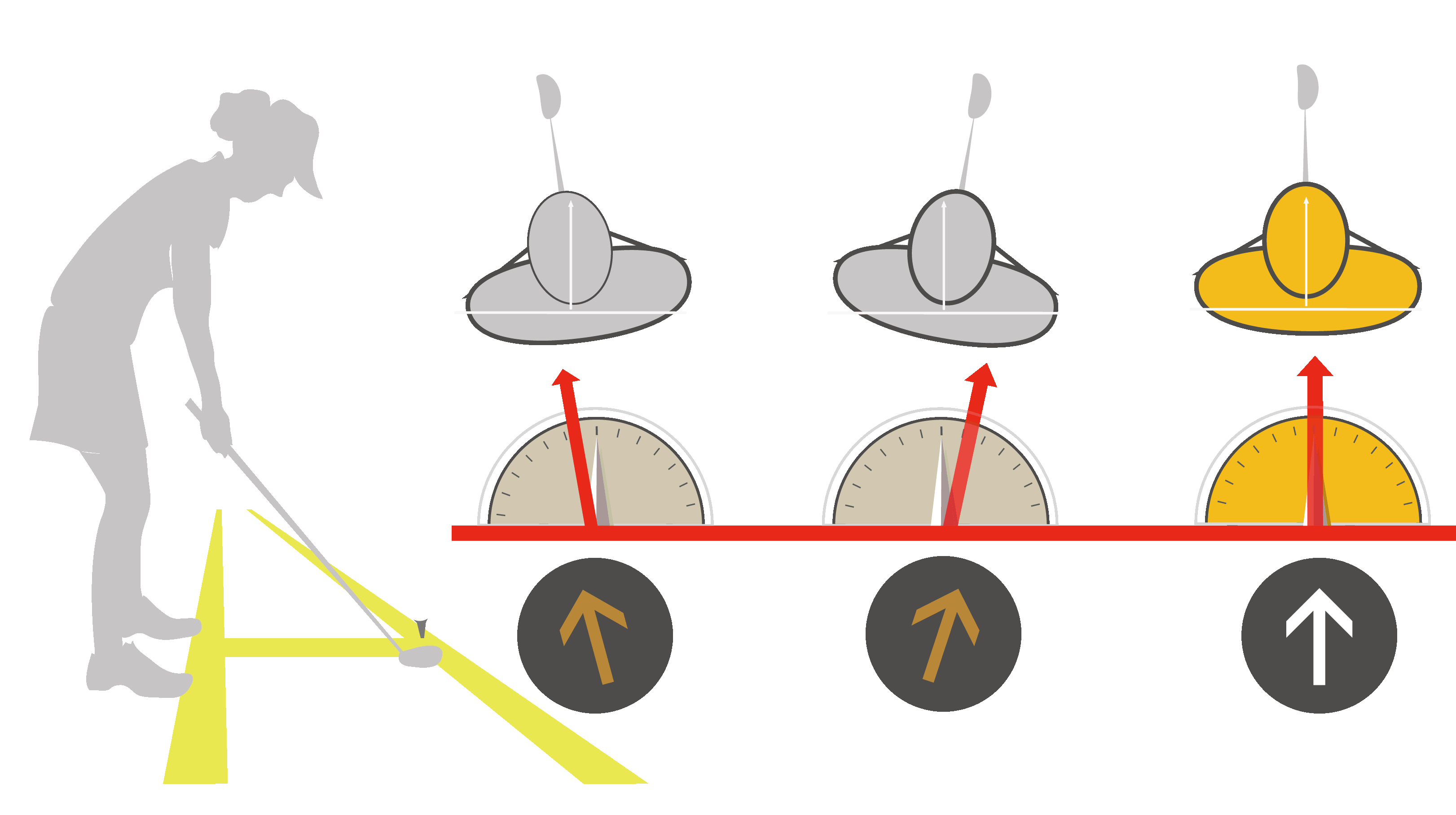 더 에이밍은 티샷 뿐 아니라 페어웨이의 세컨샷, 그리고 페어웨이의 기울기에도 무리없이 사용이 가능합니다. 필드에서 다양한 사용방법에 놀라시게 될 겁니다. 타겟보다 왼쪽을 겨냥하고 페이드샷을 치는 것도 가능해 집니다.